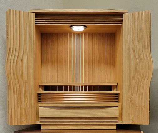 無垢の扉に波紋文様を施しました。無垢材の質感と背板のスリットからこぼれる光が印象的な、高級感のあるお仏壇です。